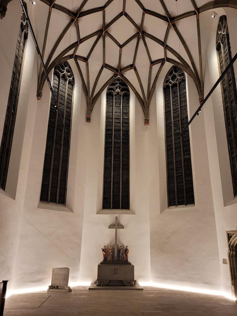 Schon immer war das Kreuzbogengerippe des Hoch-Chors eine Besonderheit. Mit dem neuem Lichtkonzept wird dies in eindrucksvoller Weise unterstrichen.